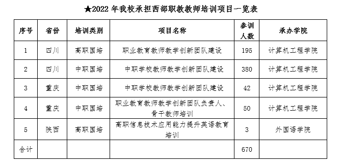 2022年我校积极响应国家关于开展教育对口帮扶的号召,组织实施职教教师培训精准帮扶西部项目5项(见下表),涉及四川、重庆、陕西等省、直辖市。