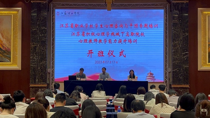 7月17日上午,2023年积极心理学视域下的高职院校心理教师教学能力提升培训开班典礼在明都大饭店举行。江苏理工学院教育学院、教师教育学院(合署)党总支书记张珍,院长李德方,党总支委员、培训项目负责人赵伟和来自全省高等职业院校的40名心理教师、辅导员、班主任等参加了开班典礼。会议由张珍主持。