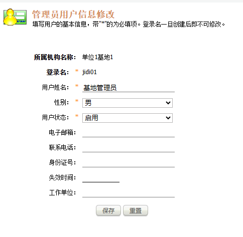 在添加管理员页面,填写各项信息,点击“保存”按钮,即可添加一个新的基地管理员账号。如下图: