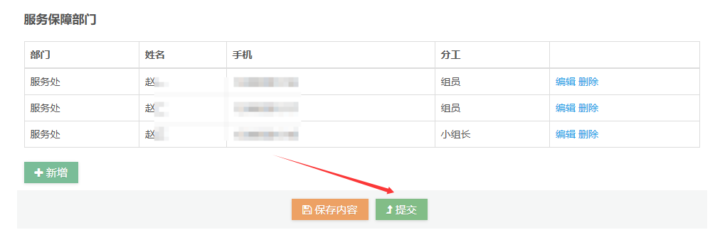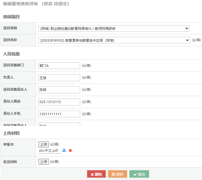 基地管理员在表单中修改信息内容后,需点击表单下方的“保存”按钮保存信息变更。同时,也可对材料进行“删除”或“提交”操作。