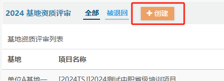 列表界面顶部设有列表标签和创建遴选材料按钮。标签用于对下方列表内容进行筛选。“被退回”标签用于筛选在上级承训单位审核环节中被承训单位退回的材料。“全部”标签则显示所有基地管理员上传的遴选材料。