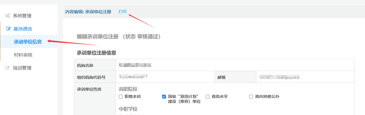 承训单位保存本单位各项信息后,点击页面最上方的“打印”按钮,可以打印预览本单位的信息。