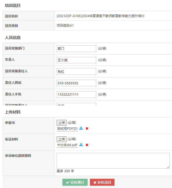 在评审表单中,承训单位管理员也可以对材料的内容进行修改,无论点击“审核通过”或“审核退回”按钮,都会对表单内容进行保存。