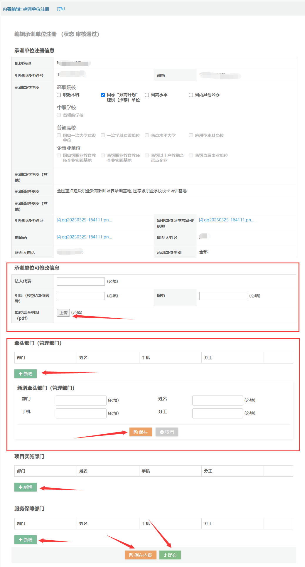 承训单位填写各项信息,点击“保存内容”按钮可以保存页面数据。
