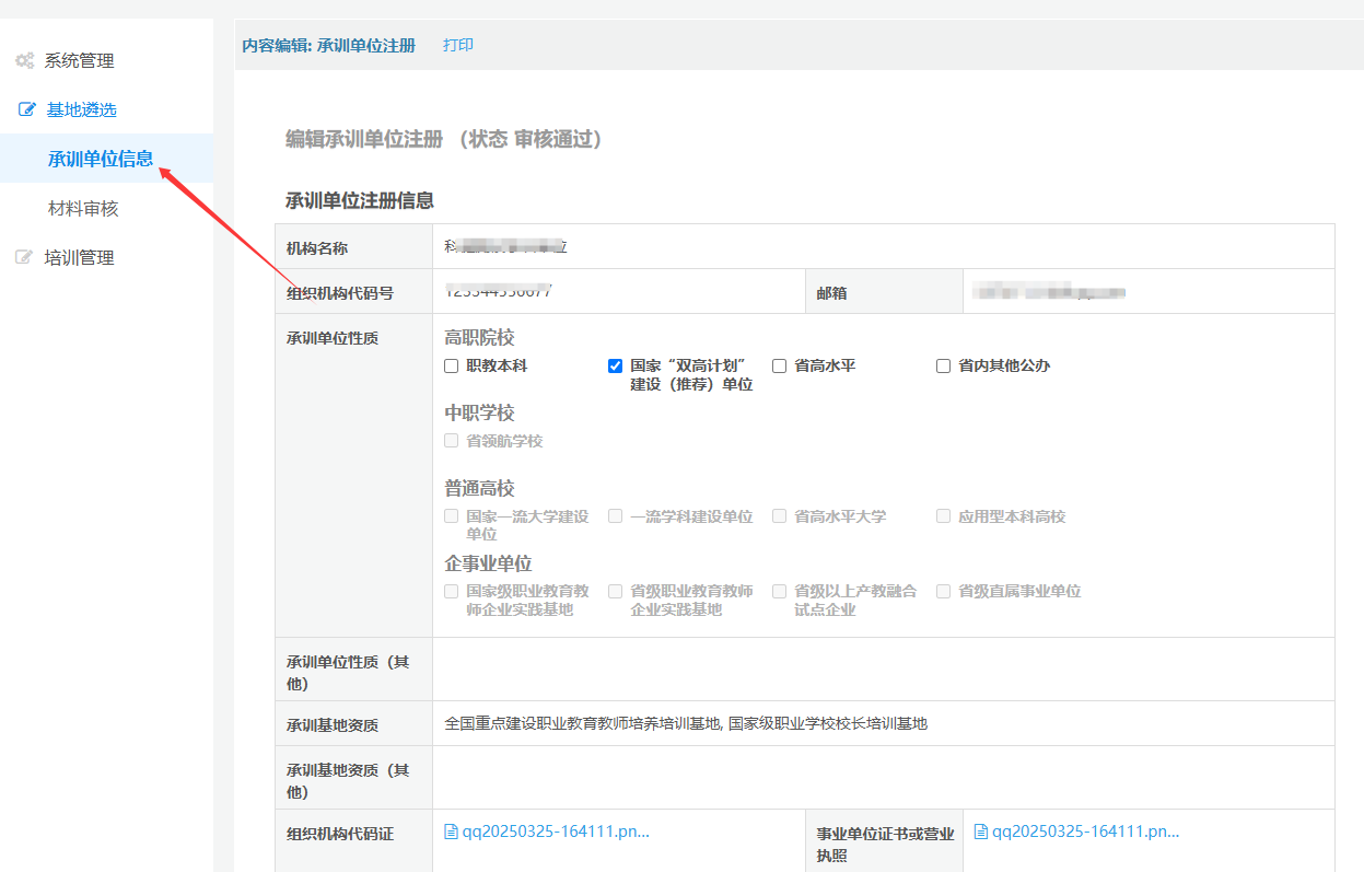 承训单位管理员在左侧菜单栏中点开“基地遴选”—>“承训单位信息”菜单,即可查看本单位详细信息。